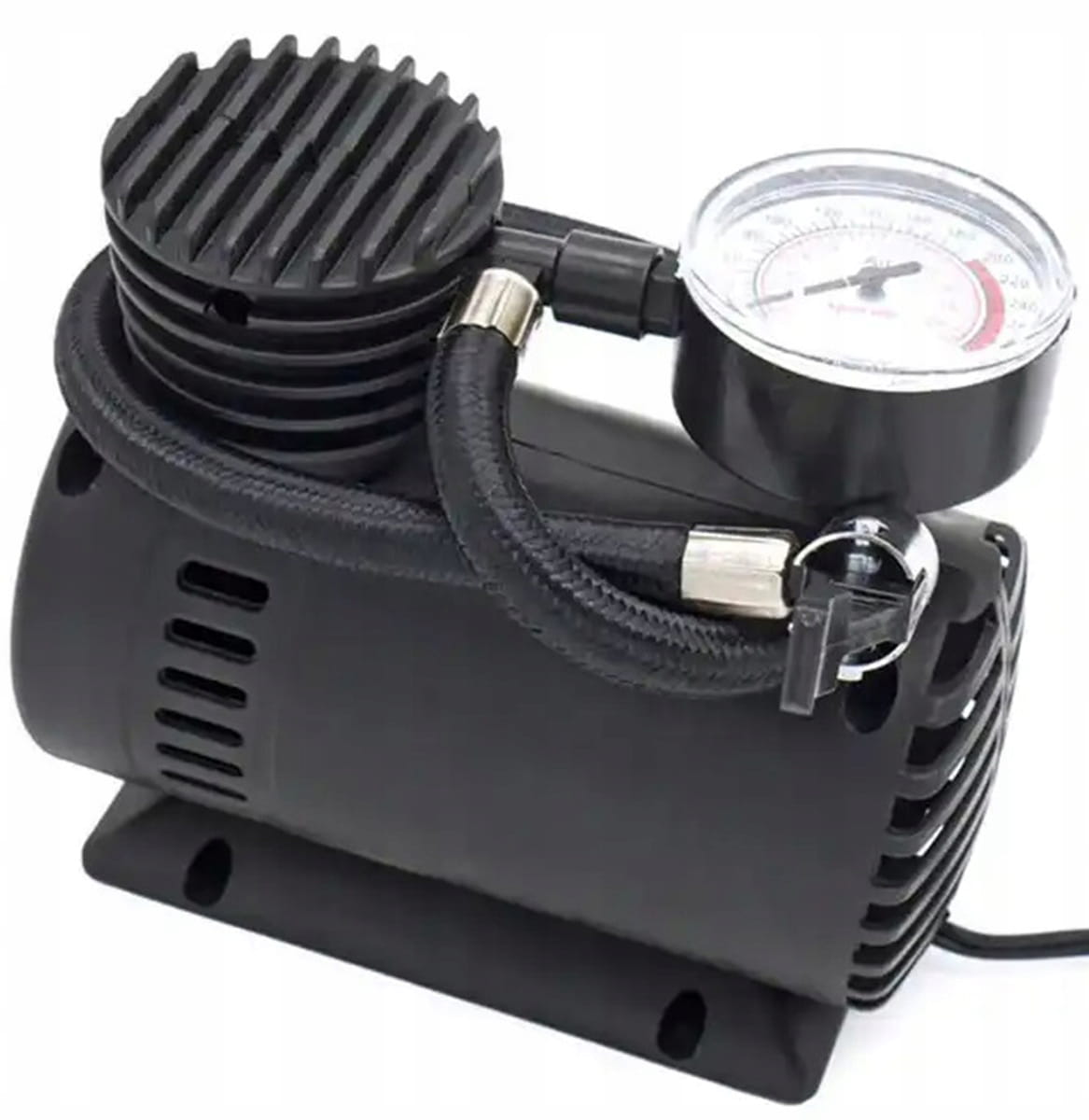 Kompaktowy kompresor do pompowania opon. Zasilany za pomocą gniazda zapalniczki samochodowej 12V co ułatwia długi przewód. Wygodny, giętki wężyk oraz dodatkowe, wymienne końcówki (3 sztuki) ułatwiają pracę z urządzeniem.