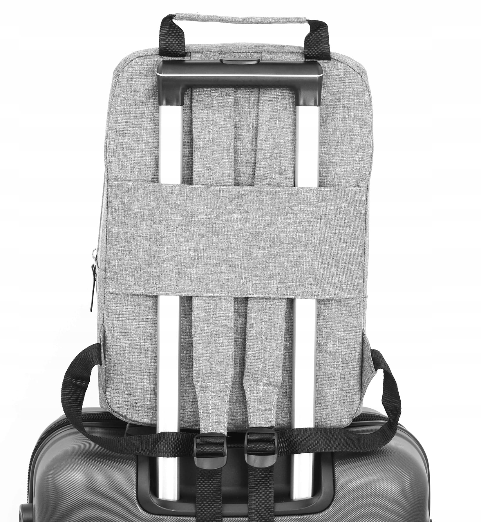 W tylnej części została wszyta obejma, którą można wykorzystać do montażu torby na walizce. Sprawi to, że w łatwy sposób można poruszać się zarówno z walizką jak i torbą.