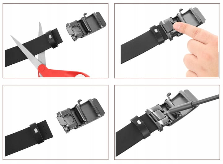 Co w sytuacji gdy kupisz zbyt duży rozmiar? To nie problem. Ten model klamry pozwala na szybkie skrócenie paska. Należy odpiąć klamrę ( wystarczy podnieść zapadkę z tyłu klamry ) dociąć pasek na odpowiednią długość oraz zamknąć klamrę.