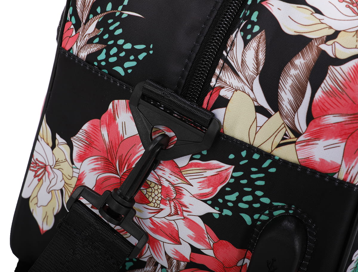 W tylnej części została wszyta obejma, którą można wykorzystać do montażu torby na walizce. Sprawi to, że w łatwy sposób można poruszać się zarówno z walizką jak i torbą