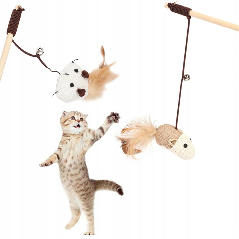 Zabawka dla kota wędka mysz myszka z piórkami dzwonek 40cm